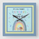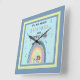 Este adorável relógio tem um arco-íris moderno com dois filhotes brancos parados sob ele. O topo do arco-íris tem pequenos impressões de cachorros subindo em ambos os lados levando a um coração no topo. A tipografia diz que é tudo sobre o Rainbows e o Puppy Dogs. As letras em "arco-íris" são todas feitas em cores diferentes e há diferentes ossos coloridos de cachorro espalhados. O fundo é um céu azul pálido com uma borda azul e amarela mais escura.