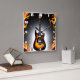 Um violão espantoso se posiciona corajosamente com chamas dançando ao seu redor, mostrando seu design único e suas cores vibrantes em uma atmosfera dramática.