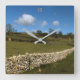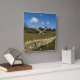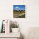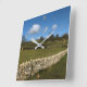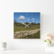 Uma parede de pedra seca cruza campos verdes sob um céu azul perfeito com as nuvens brancas macias.