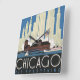 Ilustração antiga de pôster de viagem de Chicago, Illinois, Chicago Tem Tudo! Com uma vista da silhueta da cidade de Chicago, com arranha-céus, edifícios altos e o porto com navios e outros barcos.