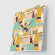 A vibrant abstract pattern with rectangles of varying sizes in teal, orange, peach, and cream tones, outlined in dark brown. Geometric and retro feel.