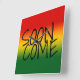 As cores três-tonificadas famosas da listra sinónimas com cultura jamaicana criam o fundo perfeito para a frase jamaicana em maiúsculas, VÊM LOGO.