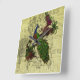O belo relógio da parede Vintage Peacock apresenta um pavão de cor brilhante em um galho com um texto mudo, floral, uvas e espirais.