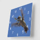 O beija-flor nesta imagem é capturado em voo de médio contra um belo céu azul. O desfoque de movimento das asas dá uma ideia de quão rápido essas pequenas asas batem. O pássaro está quase centrado no relógio e tem números brancos. Copyright © 2013 Fred Ziegler