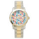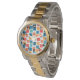 Este relógio masculino tem um design geométrico de quadrados na tangerina, papoila, coral e tons espalhados com seus contornos.