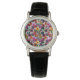 Este relógio feminino tem um design geométrico de quadrados dentro quadrados em quadrados castanho, preto, tijolo, amarelo, verde, roxo, ouro, rosa, vermelho, cinza num campo de cinzas mais leves.