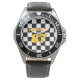 Celebrate a birthday, anniversary, or other special day with this custom racing inspired stainless steel watch. The name and number sits centered in outline text (the red and yellow can be changed to the colors of your choice) on a checkered background. This watch is ideal for racing fans.