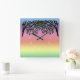Árvore, em preto com tom de verde, atingindo de cantos superiores sobre os algarismos brancos da face do relógio. O plano de fundo é a faixa das cores do arco-íris que se somam através do roxo azul, rosa, vermelha, laranja, amarela e verde, de cima para baixo.