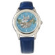 Um guaxinim doce pende de um galho de árvore na floresta com fundo azul. Este bonito relógio de bosque é perfeito como um primeiro relógio para uma menina ou para um menino.