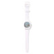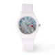Um relógio com uma fotografia cênica da natureza com um cardeal vermelho brilhante. Contrastado com um pano de fundo de inverno externo com neve suavemente caindo.