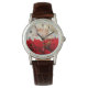 Um relógio com uma fotografia festiva de férias com um buquê de poinsetos vermelhos no fundo. Luzes de anzol do ouro em segundo plano. Estilo sofisticado clássico. Uma tipografia feliz de Natal escrita em uma fonte vermelha de tendência.