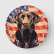Um retrato aproximado de um Labrador de Chocolate Retriever, seu pelo rendeu em um estilo pareado, com uma bandeira americana ligeiramente turva como fundo. Os olhos do cão estão focados no espectador, transmitindo um sentido de lealdade e patriotismo. As cores vermelha, branca e azul da bandeira são muda, criando uma atmosfera quente e nostálgica. Presente ideal para amantes de labrador.