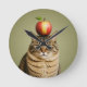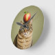 Gato engraçado com uma maçã balançando em cima de sua cabeça.