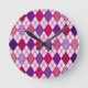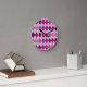 Este relógio de parede tem um design de deco de arte de formas de diamante feitas de ângulos sobrepostos em linhas pretas coloridas em tons roxos e cor-de-rosa com linhas pretas diagonais fazeres a design parece argyle