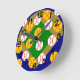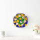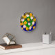 Este relógio de parede tem um design de bola do campo de uma bola feito de ouros e semicírculo e bolas de basebol e softbolas feitas de círculos com fios.