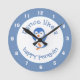 Cheerful relógio de parede azul e branca com um desenho animado de um pinguim dançante feliz com o texto opcional "Dança como um pinguim feliz".