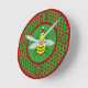 Este relógio maravilhoso apresenta uma abelha amarela fofinha com olhos negros brilhantes e pernas pretas. As antenas são verdes e as listras da abelha alternam entre verde e amarelo. A abelha está vestindo um chapéu vermelho e branco e parece pronta para celebrar o Natal. O fundo é constituído por flores bonito de poinsettia vermelha, cada uma com um centro amarelo brilhante.