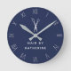 Relógio de parede redonda para um salão de cabelo em azul marinho com algarismos romanos feitos por pinos bobby. Adicione o nome do seu salão de cabelo ou do seu negócio de penteados em letras modernas sob um par de tesouras brancas.