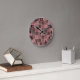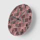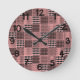 Este relógio de parede tem um design Boho de quadrados com padrões em preto e rosa.
