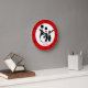 Relógio de bola de boliche e pinos redondos que apresenta um ícone minimalista de três pinos de boliche pretas com faixas vermelhas, uma bola e seu texto sobre fundo branco com borda vermelha. As ideias perfeitas para o jogador fanático e o amante das boliches.