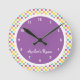 O relógio colorido da Bolinhas do banheiro da Garota Púrpura personalizado com seu nome. Parte de um grande conjunto de quartos de bolinhas arco-íris.