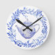 Relógio Redondo Bule de Chá Azul e Branco com Grinalda de Folhas