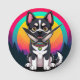 Ilustração de um animador cão animado sentado em frente a um fundo colorido do arco-íris, com um ambiente lúdico e cercado por uma paisagem serena de floresta, enfatizando alegria e arte vibrante.