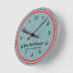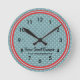 Este relógio de parede alimentado por bateria é projetado para ser um toque de na moda para qualquer casa, viagem ou cabine de férias do RV e não requer uma fonte elétrica. Projetado em um padrão retrô em tons de vermelho e lacre e pronto para seu próprio texto personalizado. Veja muitos itens de coordenação em Camp_and_Cottage na Zazzle.
