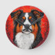 O rosto do cachorro está colocado contra um fundo circular vermelho ousado. O cachorro apresenta marcações distintas com pelos pretos, marrons e brancos, e olhos laranja impressionantes, dando-lhe uma aparência expressiva e cativante.