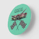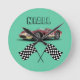 Um carro de corrida desportivo com bandeiras marcadas abaixo num pano de fundo verde onde no topo é onde você pode personalizá-lo com um fazer de nome único e seu. O esporte divertido vibe a decoração para qualquer quarto de meninos.