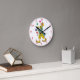 Um palhaço de circo vestindo um chapéu amarelo, calças de bolinhas e grandes calçados, está fazendo malabarismo com bolas vermelhas, amarelas, azuis e verdes. Os números de clock e a borda redonda fina são vermelhos em um fundo branco. Divertido para crianças ou adultos.