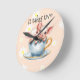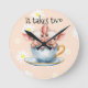 Cute "It takes Two" Teacup Piglets Design round clock featuring, cute twin piglets in a teacup set on a white floral daisy and yellow background.