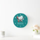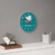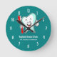 Um relógio personalizado com uma ilustração de um estilo de desenho animado, um grande dente branco sorrindo alegremente segurando uma escova de dentes vermelha e dando aos polegares uma placa para cima.