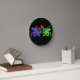 Wall clock featuring two dragons breathing fire. A charming edition to a bedroom or playroom. Contemporary purple and lime on black background.