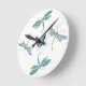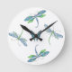 Design original de Sandra Gale de duas libélulas brancas diferentes em blues e verdes ao redor de uma borboleta como centro do relógio.