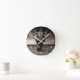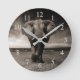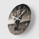 Este relógio de parede acrílico mostra uma fotografia de um elefante caminhando numa praia.