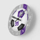 Esta equipe desportiva colore relógio temático do futebol para uma menina ou um menino apresenta um gráfico simples de bola de futebol sobre o qual você pode personalizar o nome do atleta, o monograma e o número de camisa - alguns dos painéis pretos da bola de futebol foram recoloridos roxos - o fundo é uma cinza leve personalizável com o gráfico de acento líquido de gol, faixas verticais de varanda roxas e números de relógio branco d_zynes