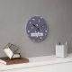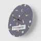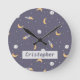 Relógio de parede fofo e engraçado com design celestial espacial com luas coloridas, foguetes, planetas e estrelas em um fundo azul roxo. Perfeito para o quarto de um menino, berçário ou sala de brinquedos.