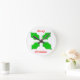 Este relógio espetacular apresenta quatro folhas sagradas completas com uma fruta vermelha para juntá-las. A fruta parece escutar na luz e as folhas têm uma qualidade tridimensional para elas. O texto vermelho ao redor do santo lê Feliz Natal.