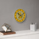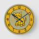 Desenho bonito de desenho animado de um gato em um relógio de fundo dourado. Decorando um berçário, um quarto de criança ou um quarto de criança? Um relógio bonito é o acessório perfeito! Este relógio também faria um novo bebê inesquecível ou um novo presente caseiro. Disponível em dois tamanhos de relógio redondo, ou um relógio quadrado. Copyright Scarebaby Design.