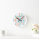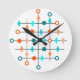 Este relógio de parede tem um design moderno do século médio de uma grade em linhas pretas com círculos laranja e lacrimejante e diamantes.