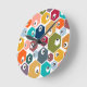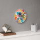Este relógio tem o médio moderno século design de hexágonos em muitas cores com círculos pretos e brancos dentro-os.