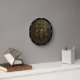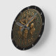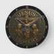 This round wall clock features a beautiful, metallic-look depiction of Jesus on the cross, with two angels figures standing below Him. Ornate scrollwork and smaller crosses frame the central image, with "JESUS" at the top and "IS HERE" at the bottom. The bronze-like finish gives this clock a profound and timeless spiritual presence for any room.