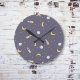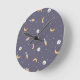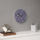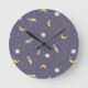 Relógio de parede fofo e engraçado com design celestial espacial com luas coloridas, foguetes, planetas e estrelas em um fundo azul roxo. Perfeito para o quarto de um menino, berçário ou sala de brincar.