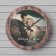 Relógio de parede de casamento moderno rústico com um design de letra à mão romântico e bonito, seus nomes personalizados e foto favorita. Ótimo presente para recém-casados, um aniversário ou Dia dos Namorados! O painel de madeira escura em estilo fazenda com textura ao fundo torna-o uma ótima adição para qualquer decoração de casa em estilo rústico, uma casa de campo ou cottage.