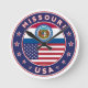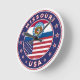 Crachá do Missouri com pavilhão do Missouri e bandeira dos EUA cores, forma arredondada. Emblema do Missouri. Selo do Missouri. Coleção dos Estados Unidos.