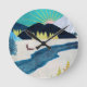 Uma paisagem digital com cores brilhantes e texturas mostrando um cogumelo com uma equipe de trenó de cão e um sol cor-de-rosa brilhante em tons de azul, ouro, ciano e amarelo.
