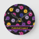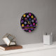 Cor-de-rosa-neon, amarelo e roxo no padrão preto de pickleball, texto personalizado Round Clock. Perfeito como presente para o jogador de picleball. Texto personalizável de ambos os lados Feliz uso e melhores desejos para seus jogos futuros!