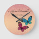 Lindo relógio de parede em rose gold conectado pelo amor celebrando um casal e seu amor com seus nomes escritos em letra cursiva e conectados com um desenho espiral e com uma data significativa. Decorado com uma ilustração fofa de duas borboletas, uma roxa e uma azul. Presente moderno e elegante para um casal que terá tanto valor prático quanto decorativo. Você pode fazer disso um presente de aniversário, um presente de casamento ou um presente de noivado e sim, está perfeitamente bem se for um presente que você está fazendo para si mesmo e seu parceiro.