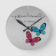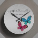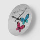 Lindo relógio de parede cinza prateado conectado pelo amor celebrando um casal e seu amor. Personalizado com os nomes do casal escritos em letra cursiva e conectados por um coração espiralado. Também personalizado com uma data personalizada. Decorado com uma ilustração fofa de duas borboletas, uma roxa e uma azul. Presente moderno e elegante para um casal que terá tanto valor prático quanto decorativo. Você pode fazer dele um presente de aniversário, um presente de casamento ou um presente de noivado e, sim, está tudo bem se for um presente que você está dando a si mesmo e ao seu parceiro para celebrar sua bela conexão de amor.